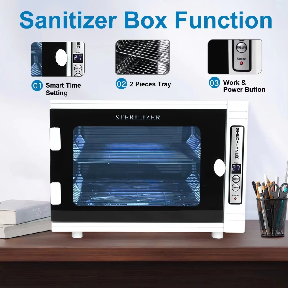 This sterilizer is equipped with a high-performance ultraviolet disinfection lamp combined with far-infrared heating, delivering up to 99% sterilization efficiency. It effectively eliminates bacteria, viruses, and contaminants from towels, scissors, nail nippers, tweezers, manicure and pedicure tools, and medical accessories.