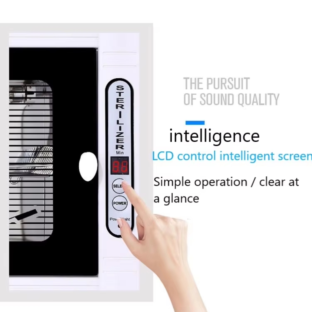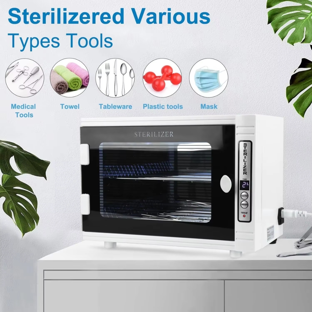 This sterilizer is equipped with a high-performance ultraviolet disinfection lamp combined with far-infrared heating, delivering up to 99% sterilization efficiency. It effectively eliminates bacteria, viruses, and contaminants from towels, scissors, nail nippers, tweezers, manicure and pedicure tools, and medical accessories.